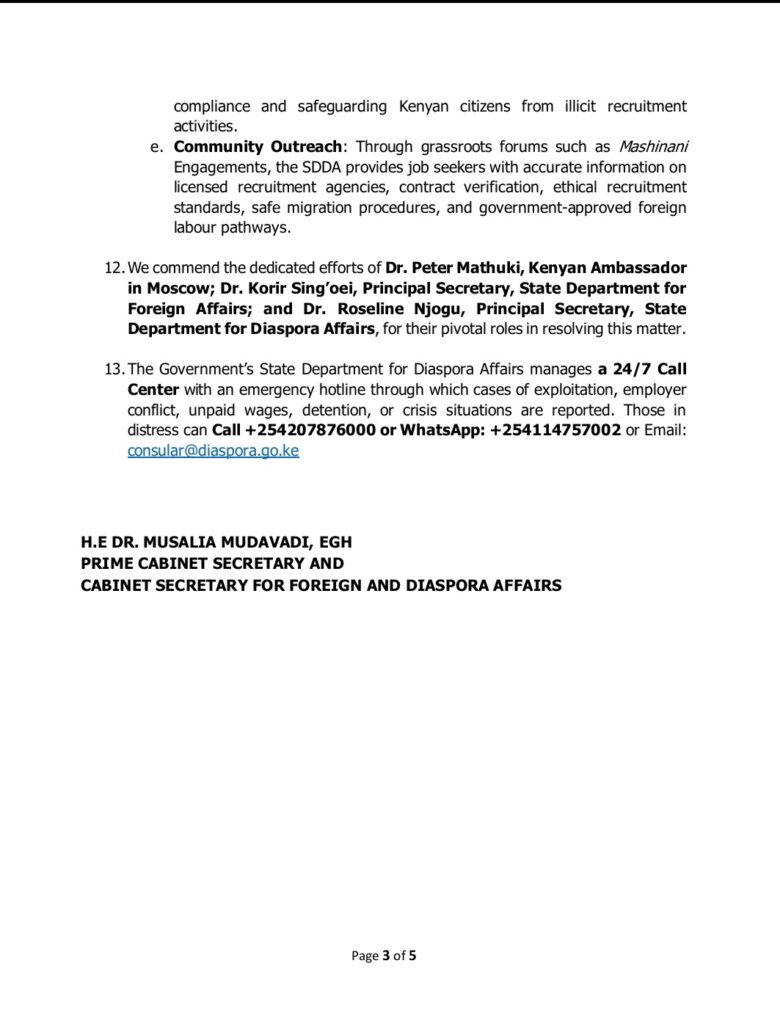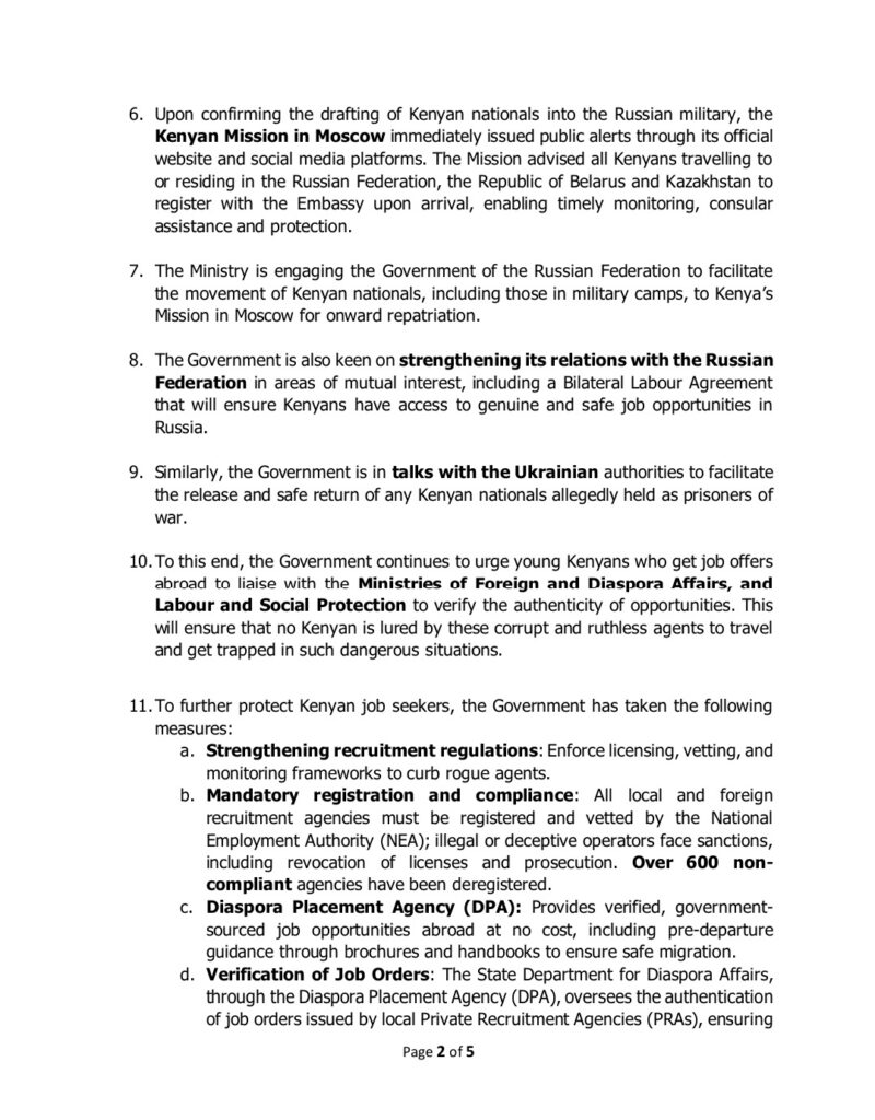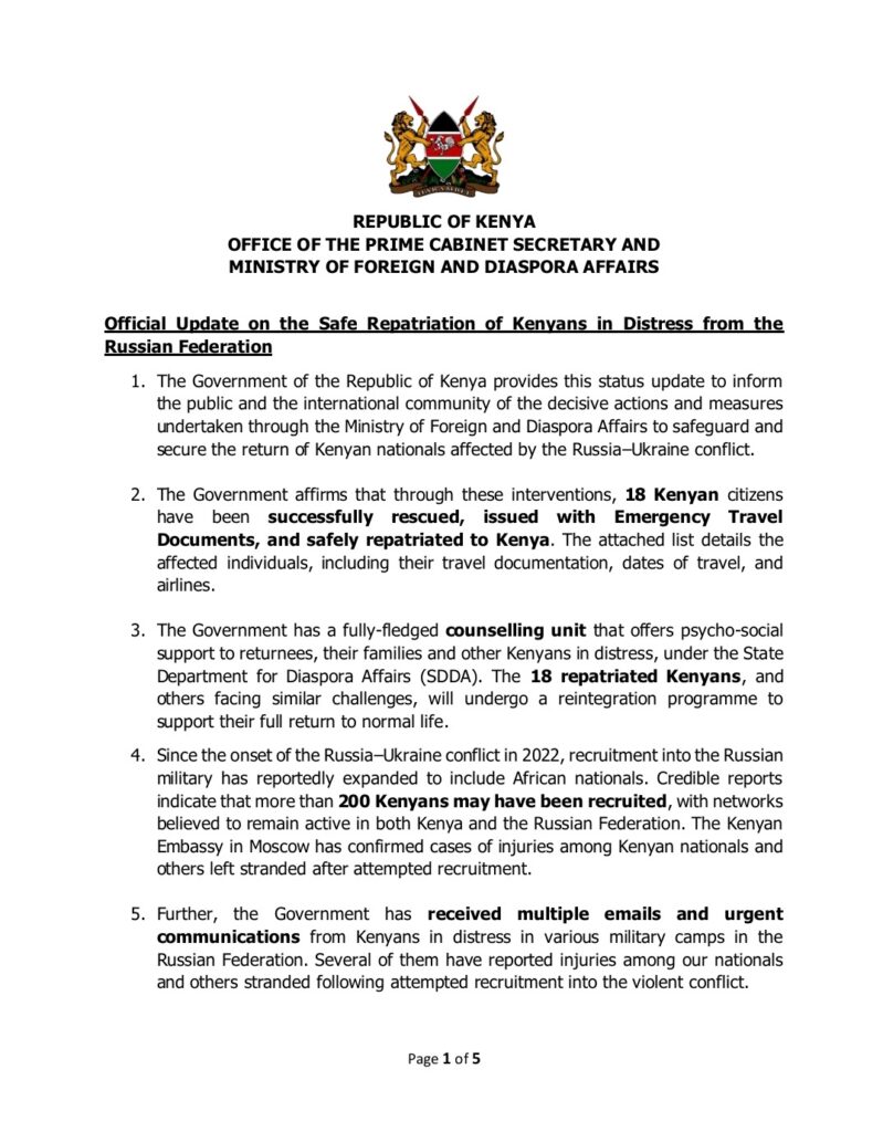At the same time, Foreign Affairs Cabinet Secretary Musalia Mudavadi revealed that the government was engaging Russian authorities to facilitate the transfer of Kenyan citizens, including those in military camps, to the Kenyan mission in Moscow for repatriation.